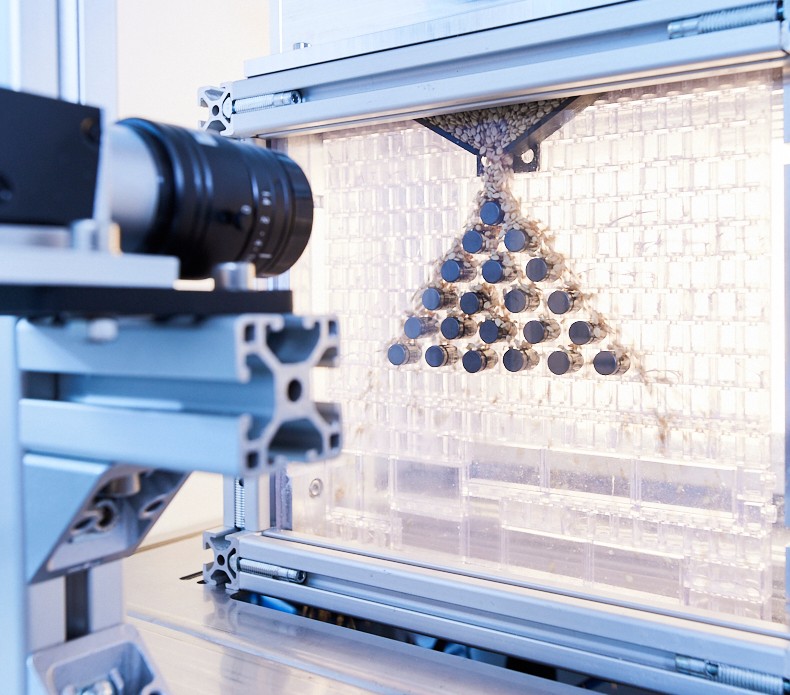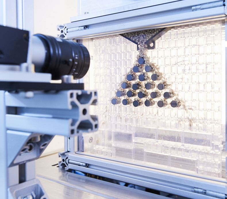 The image shows a typical test setup for our patent-pending FlowBoard, which we use to determine discrete element model parameters. The FlowBoard allows us to record many characteristics of the powder flow simultaneously in tailored obstacle courses. This apparatus enables us to calibrate a multitude of model parameters with a small number of experiments.